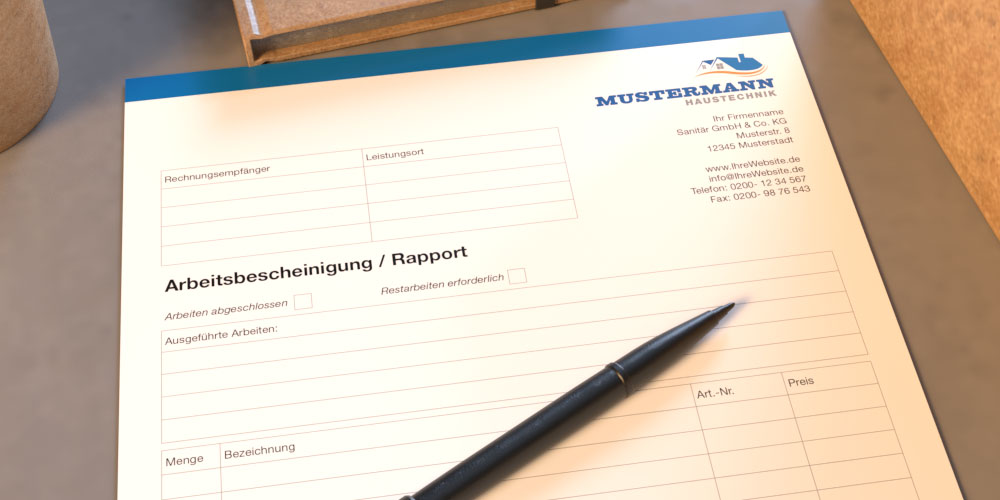Mit dem Rapport-Druchschreibesatz können Sie übersichtlich Ihre geleistete Arbeit dokumentieren. Der Stundenzettel schafft Transparenz für Ihre Kunden und Ihre Buchhaltung. Mit den Firmenaufklebern können Werkzeuge und Arbeitsgeräte einheitlich gekennzeichnet werden.